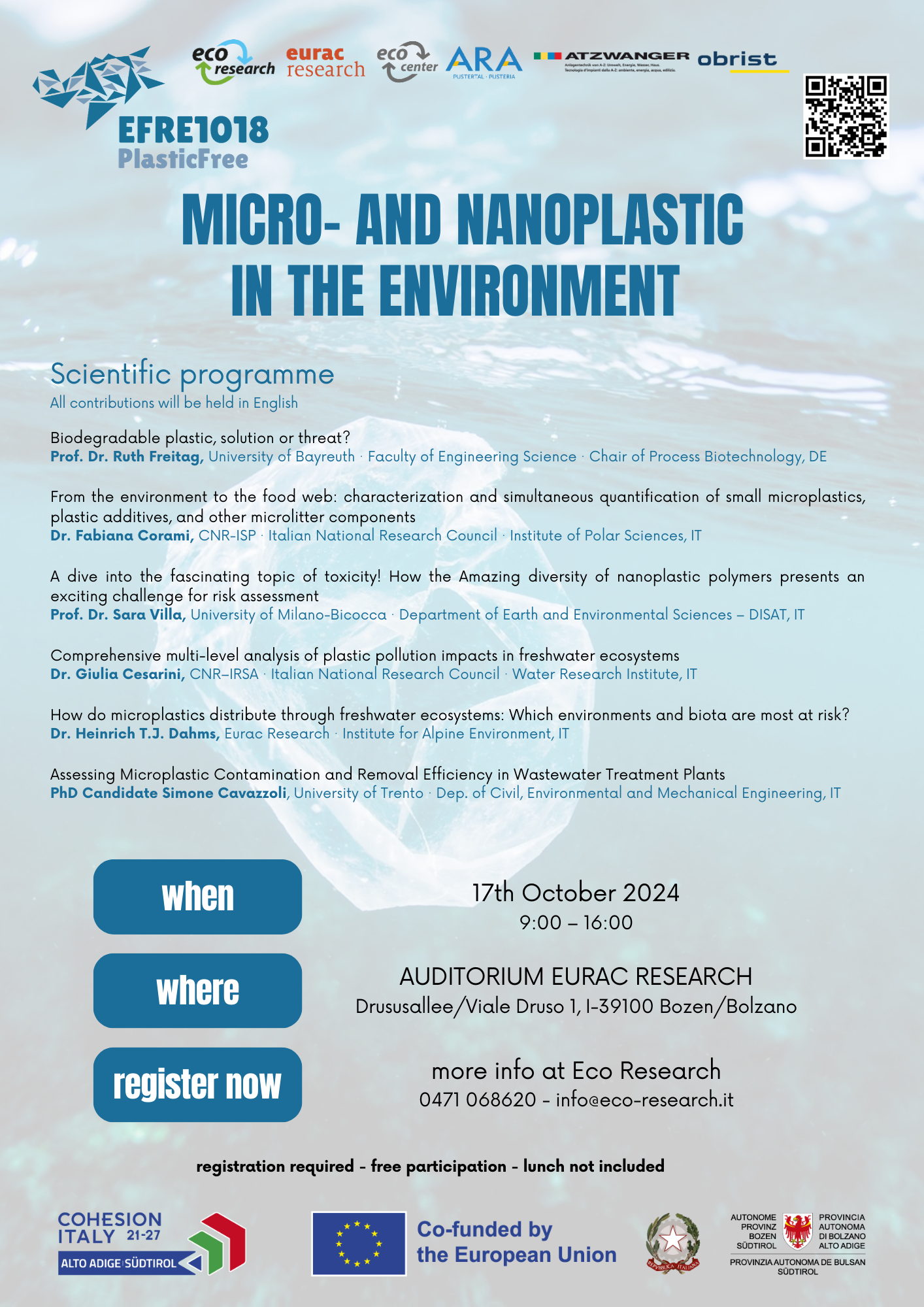Im Anschluss an die Präsentation des EFRE1018-PlasticFree-Projekts werden Riccardo Sbarberi und Lara Nigro von der Universität Mailand ihre Studien über Mikroplastik und die Bewertung von Flüssigkunststoffen in Süßwasserökosystemen vorstellen.